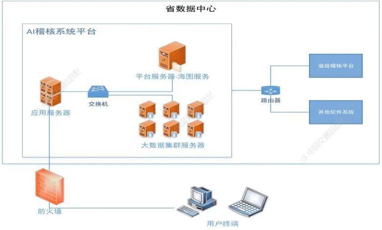 數(shù)據(jù)源是開展收費(fèi)稽核工作的基礎(chǔ),包括通行、交易、牌識(shí)、視頻等采集數(shù)據(jù)和車輛發(fā)行、路網(wǎng)、費(fèi)率、節(jié)點(diǎn)等基礎(chǔ)數(shù)據(jù),具體如下[8]。1、車道收費(fèi)數(shù)據(jù)具體包括車道收費(fèi)交易數(shù)據(jù)和車道牌識(shí)數(shù)據(jù),其中車道收費(fèi)交易數(shù)據(jù)包括出入口站點(diǎn)、出入口時(shí)間、車牌、車型、軸重、軸數(shù)、行駛里程、收費(fèi)金額等;車道收費(fèi)牌識(shí)數(shù)據(jù)包括收費(fèi)站編號(hào)、抓拍時(shí)間、識(shí)別車牌號(hào)、識(shí)別車型、抓拍圖片等。2、門架計(jì)費(fèi)數(shù)據(jù)和牌識(shí)數(shù)據(jù)具體包括門架計(jì)費(fèi)交易數(shù)據(jù)和門架牌識(shí)數(shù)據(jù),其中,門架計(jì)費(fèi)交易數(shù)據(jù)包括入口信息、交易時(shí)間、車型、車牌、計(jì)費(fèi)里程、計(jì)費(fèi)金額等;門架牌識(shí)數(shù)據(jù)包括門架編號(hào)、抓拍時(shí)間、識(shí)別車牌號(hào)、識(shí)別車型、拍攝位置、抓拍圖片等。3、發(fā)行數(shù)據(jù)包括ETC和OBU的發(fā)行數(shù)據(jù),具體包括發(fā)行省份、發(fā)行時(shí)間、車牌、車型、顏色、圖片、軸數(shù)以及辦理人的相關(guān)信息。4、跨省拆分?jǐn)?shù)據(jù)包括車輛跨省通行的車輛通行數(shù)據(jù)和收費(fèi)數(shù)據(jù),具體包括車輛通行收費(fèi)站出入口數(shù)據(jù)、車道交易數(shù)據(jù)、門架計(jì)費(fèi)數(shù)據(jù)等信息。5、全省治超數(shù)據(jù)和治超牌識(shí)數(shù)據(jù)主要包括車輛通行數(shù)據(jù)、計(jì)重?cái)?shù)據(jù)和牌識(shí)數(shù)據(jù),具體包括車輛通行時(shí)間、車牌、車型、軸重、軸型、圖片等數(shù)據(jù)。(二) AI稽核系統(tǒng)設(shè)計(jì)思路1、AI稽核網(wǎng)絡(luò)拓?fù)銩I稽核系統(tǒng)采用了大數(shù)據(jù)集群服務(wù)器、地圖引擎服務(wù)器、應(yīng)用服務(wù)器,網(wǎng)絡(luò)拓?fù)淙鐖D2所示。其中,大數(shù)據(jù)集群服務(wù)器主要對(duì)收費(fèi)數(shù)據(jù)、發(fā)行數(shù)據(jù)、拆分?jǐn)?shù)據(jù)、治超數(shù)據(jù)、牌識(shí)數(shù)據(jù)接收、存儲(chǔ)以及對(duì)稽核模型、路徑還原等進(jìn)行計(jì)算,還能通過倒排索引對(duì)數(shù)據(jù)進(jìn)行高性能檢索;地圖引擎服務(wù)器主要實(shí)現(xiàn)地圖圖層加載、路網(wǎng)模型計(jì)算;應(yīng)用服務(wù)器主要實(shí)現(xiàn)對(duì)AI稽核系統(tǒng)的部署和接口的數(shù)據(jù)交互。