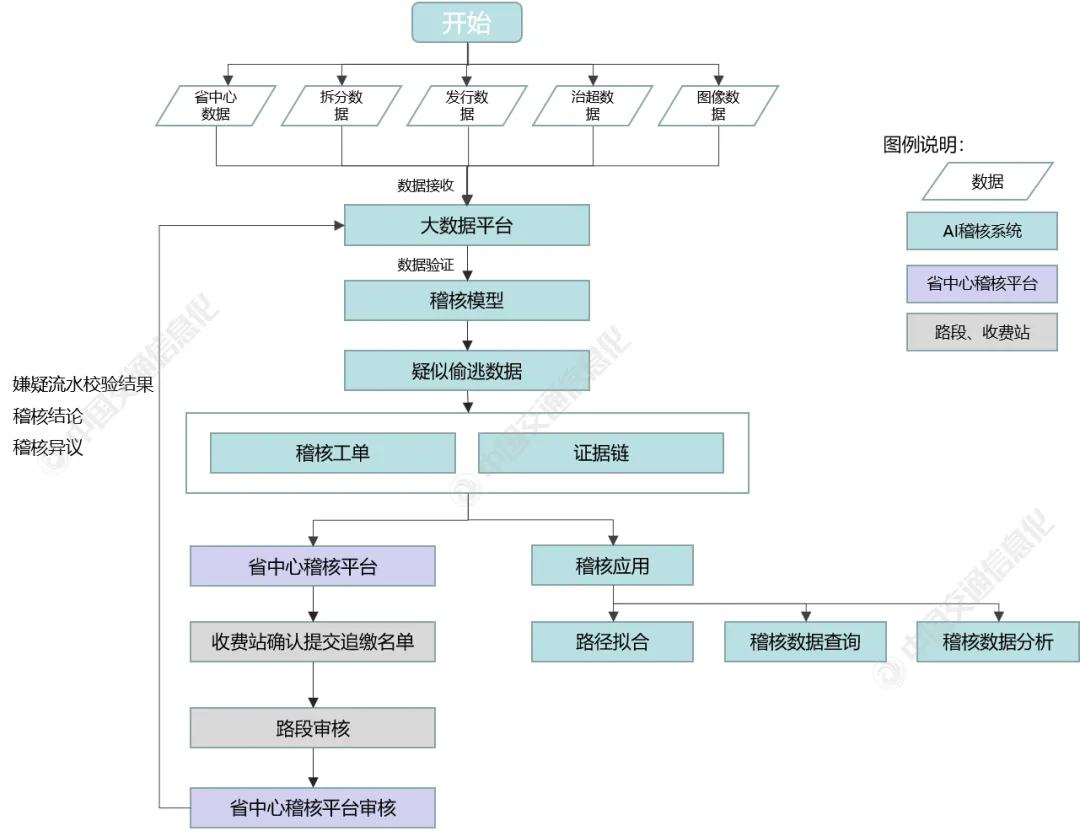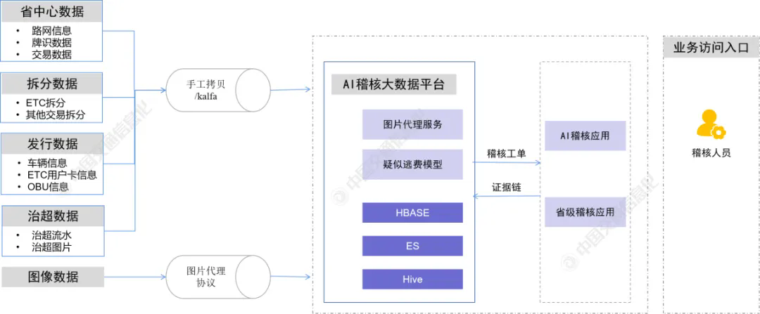 同時(shí),鑒于數(shù)據(jù)存儲(chǔ)介質(zhì)、數(shù)據(jù)存儲(chǔ)類型和數(shù)據(jù)傳輸方式的差異,通過不同工具實(shí)現(xiàn)異源、異構(gòu)數(shù)據(jù)的導(dǎo)入。其中,對(duì)實(shí)時(shí)性要求較高的監(jiān)測數(shù)據(jù)以分布式消息隊(duì)列的形式由Kafka分發(fā);關(guān)系型數(shù)據(jù)庫由Sqoop等工具直接將數(shù)據(jù)導(dǎo)入HDFS;非實(shí)時(shí)性數(shù)據(jù)選擇MapReduce計(jì)算引擎,實(shí)時(shí)性要求較高的數(shù)據(jù)選擇Spark或Storm計(jì)算框架。3、AI稽核系統(tǒng)流程AI稽核系統(tǒng)流程如圖4所示,可分為4個(gè)步驟:(1)省中心數(shù)據(jù)、拆分?jǐn)?shù)據(jù)、治超數(shù)據(jù)、發(fā)行數(shù)據(jù)等接收匯聚至大數(shù)據(jù)平臺(tái),通過稽核模型數(shù)據(jù)驗(yàn)證,得到疑似偷逃費(fèi)數(shù)據(jù);(2)系統(tǒng)根據(jù)疑似偷逃費(fèi)數(shù)據(jù),自動(dòng)匹配生成稽核工單和證據(jù)鏈,并推送至省中心稽核平臺(tái)及稽核應(yīng)用;(3)省中心稽核平臺(tái)將稽核工單和證據(jù)鏈推送至收費(fèi)站,一線稽核人員確認(rèn)后提交追繳工單,工單提交至路段和省中心進(jìn)行審核;(4)省中心稽核平臺(tái)審核完畢后,生成追繳名單,并反饋校驗(yàn)結(jié)果、稽核結(jié)論等至AI稽核系統(tǒng)。