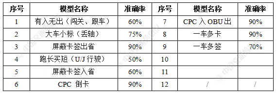 (四)稽核模型建立與準(zhǔn)確率驗(yàn)證本文所述AI稽核系統(tǒng)根據(jù)不同逃費(fèi)類型建立對(duì)應(yīng)模型,目前已實(shí)現(xiàn)大車小標(biāo)、有入無出、屏蔽卡簽入省、屏蔽卡簽出省、跑長買短、CPC倒卡、CPC入OBU出、一車多卡、一車多簽等近10種偷逃費(fèi)行為稽核。以大車小標(biāo)偷逃費(fèi)行為進(jìn)行舉例說明。改變車型(車種):大車小標(biāo)是指發(fā)行車型跟實(shí)際車型不符。通過非法手段辦理或套取使用與實(shí)際車型不符的車輛標(biāo)簽,達(dá)到偷逃費(fèi)的目的?;藬?shù)據(jù)驗(yàn)證方式如下:(1)通過交易數(shù)據(jù)中的車牌、車牌顏色和車型與發(fā)行數(shù)據(jù)對(duì)比,確定大車小標(biāo);(2)利用入口稱重?cái)?shù)據(jù),在收費(fèi)數(shù)據(jù)中的入口交易數(shù)據(jù)搜索軸數(shù)與車型不符的車輛;(3)搜索收費(fèi)數(shù)據(jù)中的入口交易數(shù)據(jù),車型為一型貨車,且車牌顏色為黃色的車輛;(4)篩選車輛通過ETC專道和人工車道的收費(fèi)車型存在不一致的情況,通過車牌號(hào)篩選某個(gè)車牌多次出現(xiàn)兩個(gè)及以上的車型的車輛;(5)對(duì)篩選出的車輛,根據(jù)大數(shù)據(jù)平臺(tái)圖片、交易數(shù)據(jù),對(duì)特征點(diǎn)進(jìn)行對(duì)比分析,形成初步結(jié)論。通過對(duì)稽核模型分析數(shù)據(jù)與稽核人員核實(shí)數(shù)據(jù)對(duì)比分析,進(jìn)行稽核模型分析篩查準(zhǔn)確率驗(yàn)證,稽核模型準(zhǔn)確率如表2所示。屏蔽卡簽、倒卡通行介質(zhì)等稽核模型準(zhǔn)確率較高,達(dá)90%,有入無出(闖關(guān)、跟車)、跑長買短(U/J行駛)因系統(tǒng)及計(jì)費(fèi)規(guī)則、現(xiàn)場管理和證據(jù)獲取等多重因素影響,準(zhǔn)確率為50%~60%左右,但能夠滿足稽核業(yè)務(wù)需求?;四P蜏?zhǔn)確率如表2所示。